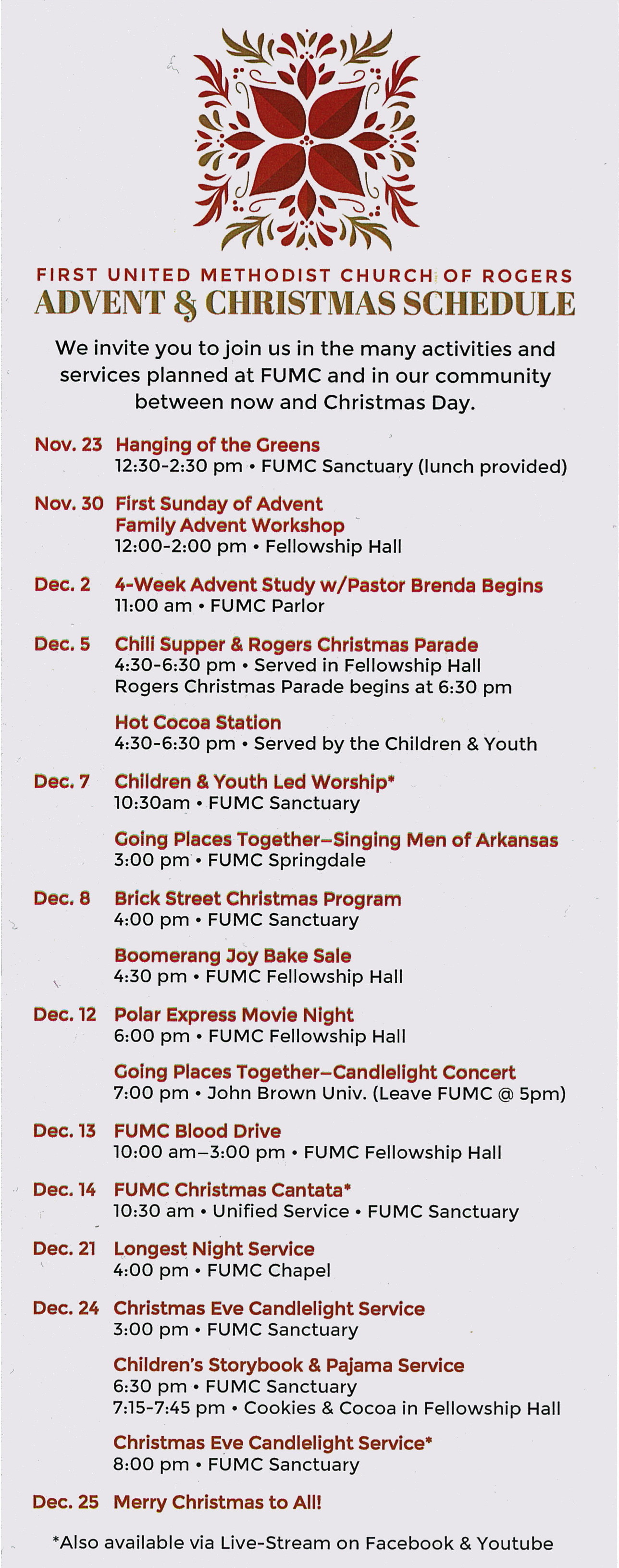 The service will be available at 10:30 am Sunday morning on Facebook Live and YouTube.